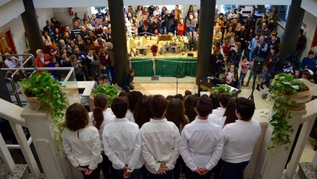 El acto de inauguración del Belén Municipal contó con la colaboración del coro infantil de la Asociación Amigos de la Música de Lorqu y la coral Jean Sibelius, lo que congregó a numerosos vecinos y vecinas en el recibidor del Ayuntamiento.