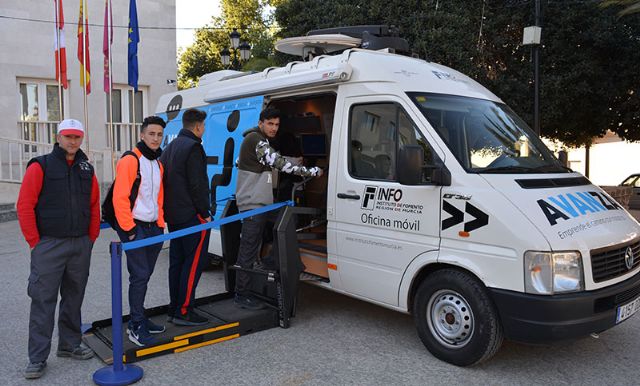 El INFOmóvil visita Lorquí durante dos horas para asesorar en materia de empleo y empresa y atiende a más de 20 personas, 15 jóvenes beneficiarios del Sistema de Garantía Juvenil, además de varios empresarios y emprendedores.