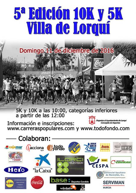 La Concejalía de Deportes del Ayuntamiento de Lorquí organiza, por quinto año consecutivo, la carrera 10KM y 5KM 'Villa de Lorquí', una prueba atlética popular en la que podrá participar cualquier deportista. La carrera se desarrollará el Domingo 11de Diciembre a partir de las 10 horas con línea de salida y llegada en el Parque de la Constitución, junto al Ayuntamiento de Lorquí (Murcia).