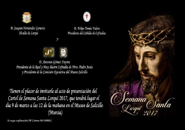 El próximo jueves 9 de Marzo a las 12.00 horas, en la Iglesia de Nuestro Padre Jesús de Murcia Museo Salzillo, tendrá lugar la presentación del cartel de Semana Santa de Lorquí 2017 que protagoniza la imagen de Nuestro Padre Jesús Nazareno de Salzillo. Pieza única en la Región de Murcia ya que es el único Nazareno del maestro escultor en la Región.