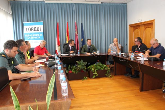 El alcalde de Lorquí, Joaquín Hernández, y el delegado del Gobierno, Francisco Jiménez, han presidido esta mañana la Junta Local de Seguridad que se ha celebrado en el Salón de Plenos del Ayuntamiento para tratar y coordinar los asuntos de seguridad ciudadana relacionados con la celebración de las próximas fiestas patronales en honor a Santiago Apóstol y la situación del municipio durante temporada estival. Al encuentro han asistido también los responsables del Cuartel de la Guardia Civil de Molina, del Consorcio de Extinción de Incendios y Salvamento de la Región de Murcia y de la Policía Local de Lorquí; así como el concejal de Seguridad Ciudadana, Isidoro Martínez.