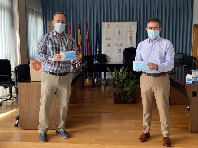 El alcalde de Lorquí, Joaquín Hernández, ha recibido esta mañana al gerente de la empresa Europea de Prevención e Higiene, Javier Romero, que ha realizado una donación de material sanitario para prevenir la propagación del COVID-19 que se repartirá a los habitantes del municipio. Esta empresa, dedicada a la comercialización de suministros industriales y vestuario de higiene laboral, que es especialista en seguridad y protección laboral, ha hecho varias donaciones en la Región, incluyendo Lorquí como uno de los municipios donde han colaborado.
